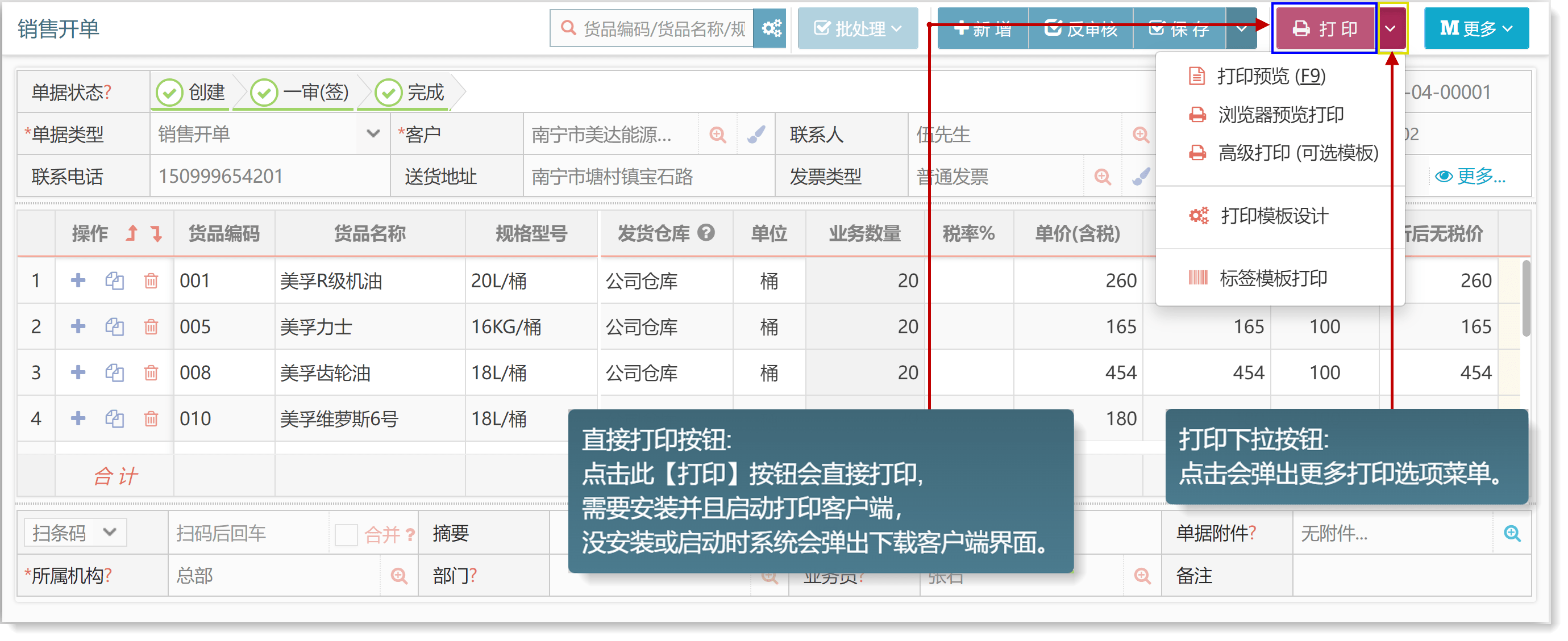 以下以【销售开单】为例对打印功能进行详细的介绍说明。