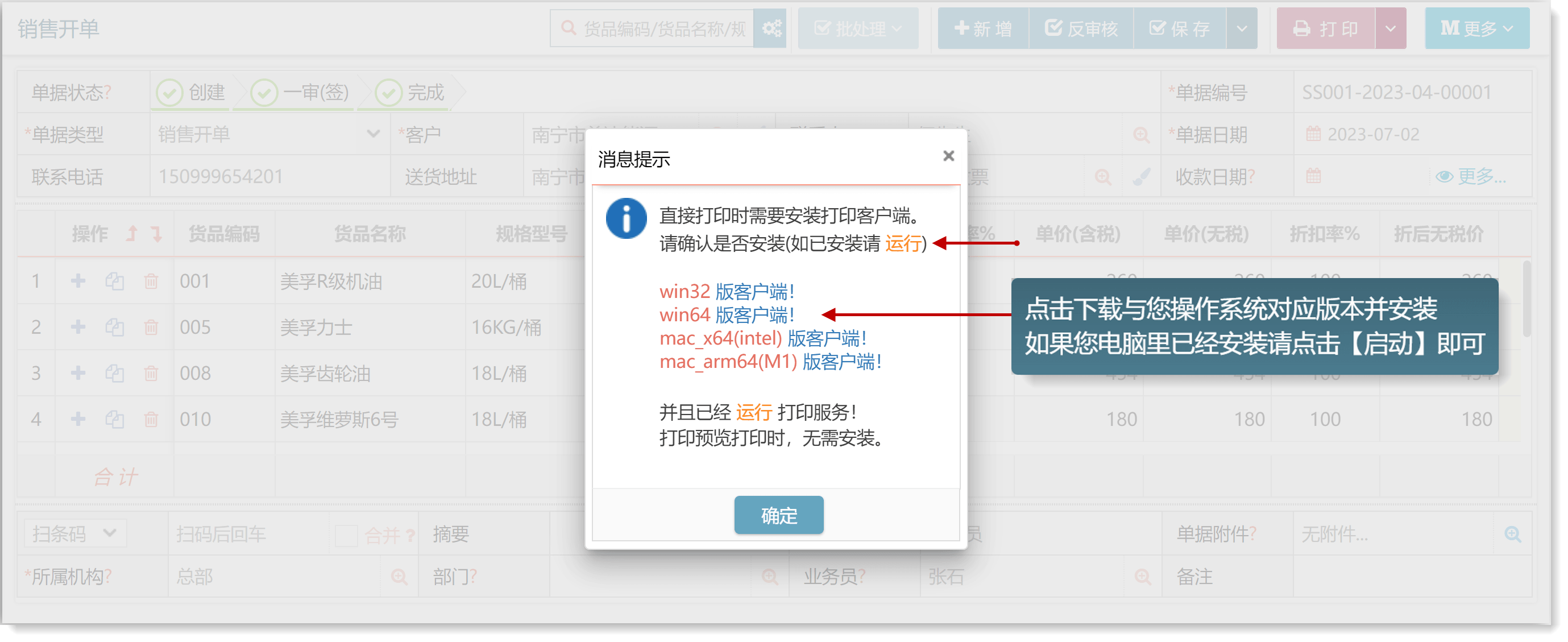 直接打印需要安装打印客户端,点击【打印】时软件会检查您电脑上是否安装并且启动了打印客户端,如果没安装或没启动