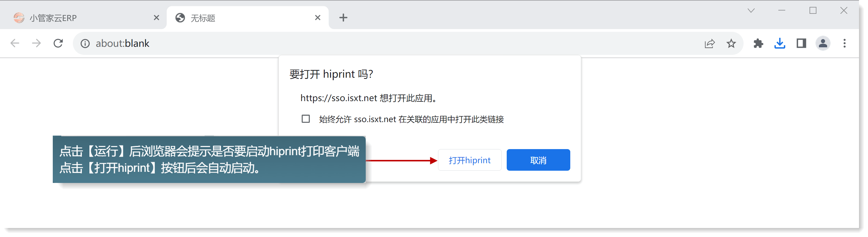 如果系统会已经安装了打印客户端,点击【运行】后浏览器会弹出提示是否要启动hiprint客户端的提示, 点击【打开hiprint】即可启动。