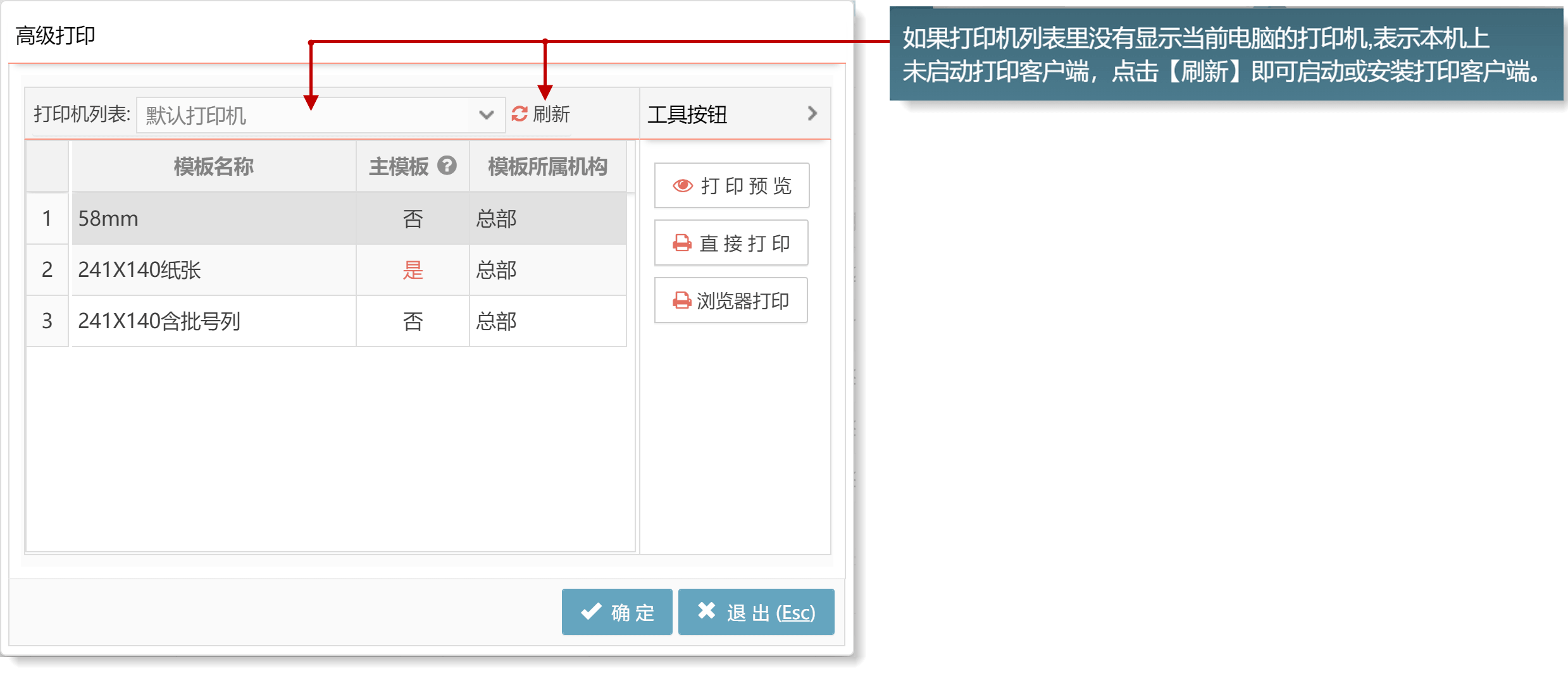 C、【高级打印(可选模板)】在弹出的页面里可以看到当前所要打印的数据的全部打印模板和当前系统里的打印机列表,从而可以选择指定模板用指定打印机进行打印或预览。
