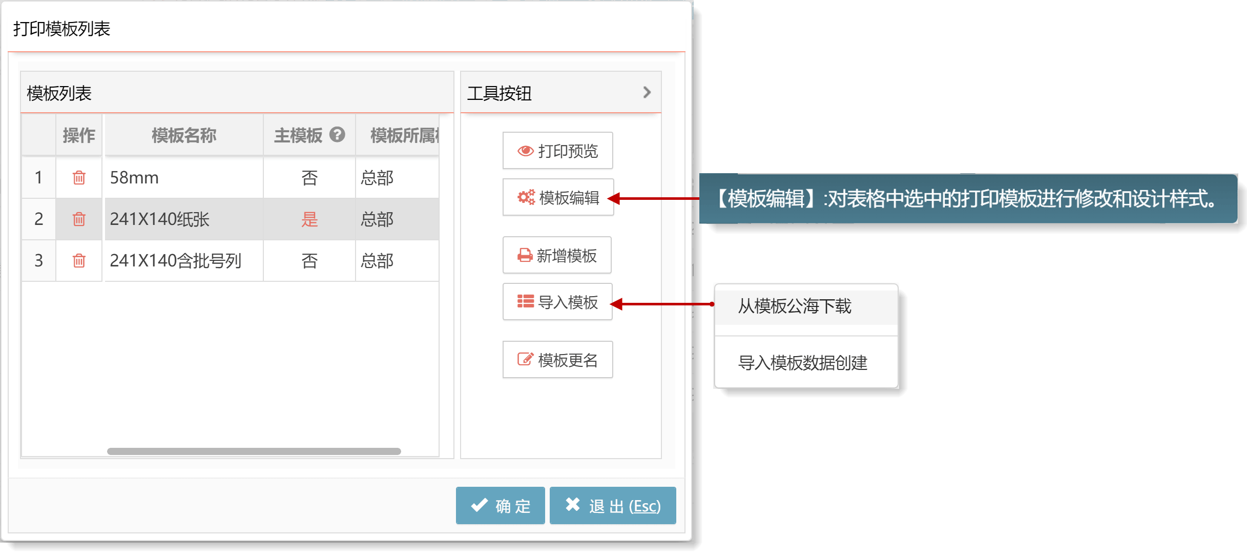 二、【模板编辑】:对当前选中的模板进行修改打印样式,会有单独的帮助页面进行详细的操作说明 模板设计器。
