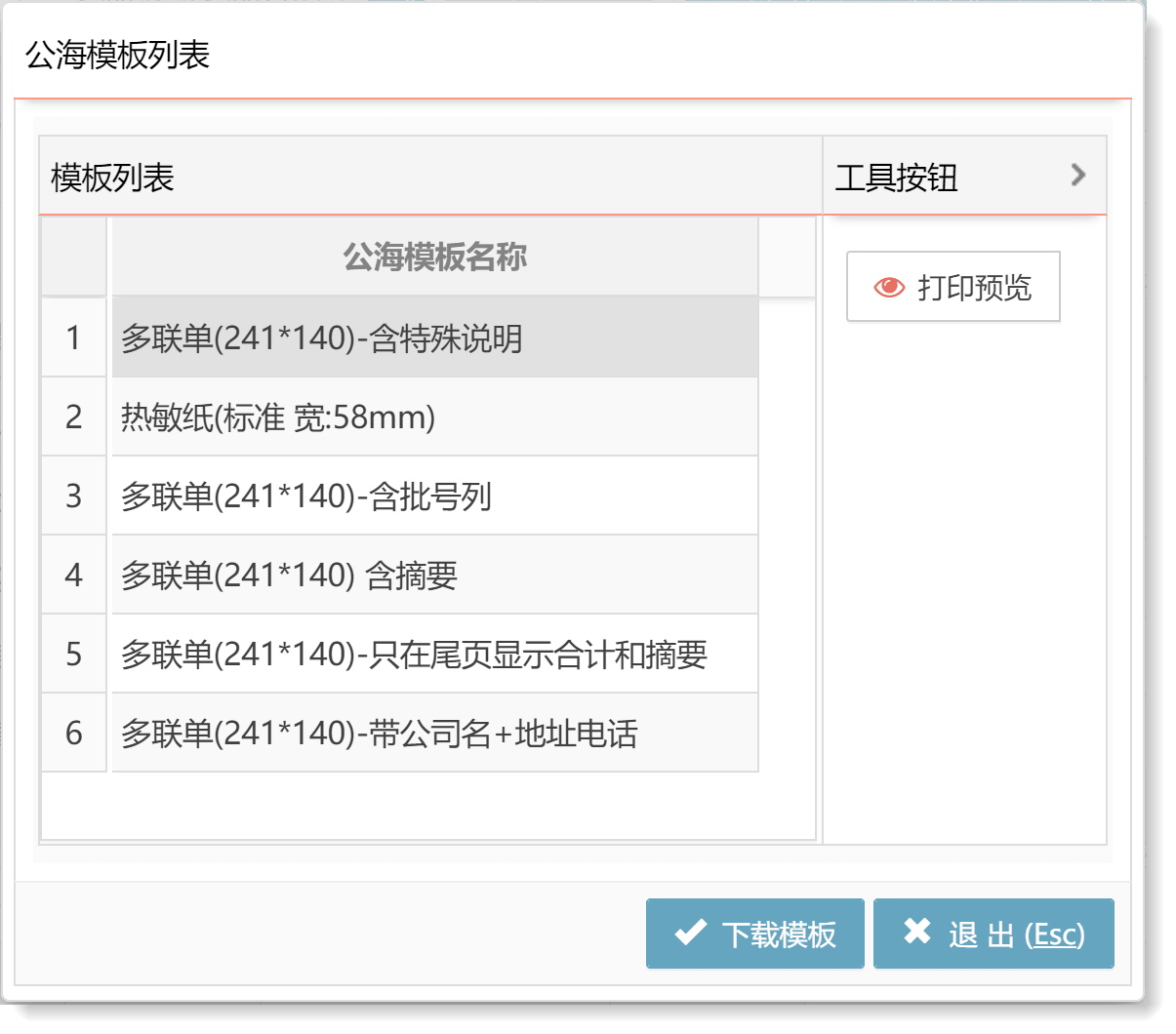 D.1 [从模板公海下载]:是指从小管家云ERP里的公共模板库里下载适合您公司的打印模板,如下图是在销售开单进入打印模板设计,再进入【从模板公海下载】 这里弹出的就是公海里“销售开单”的所有打印模板,可以对这些模板进行打印预览,从而找到适合您的模板 点击下边的“下载模板”即可下载到您的账套的销售开单的打印模板列表内了,以便以后打印或修改。
